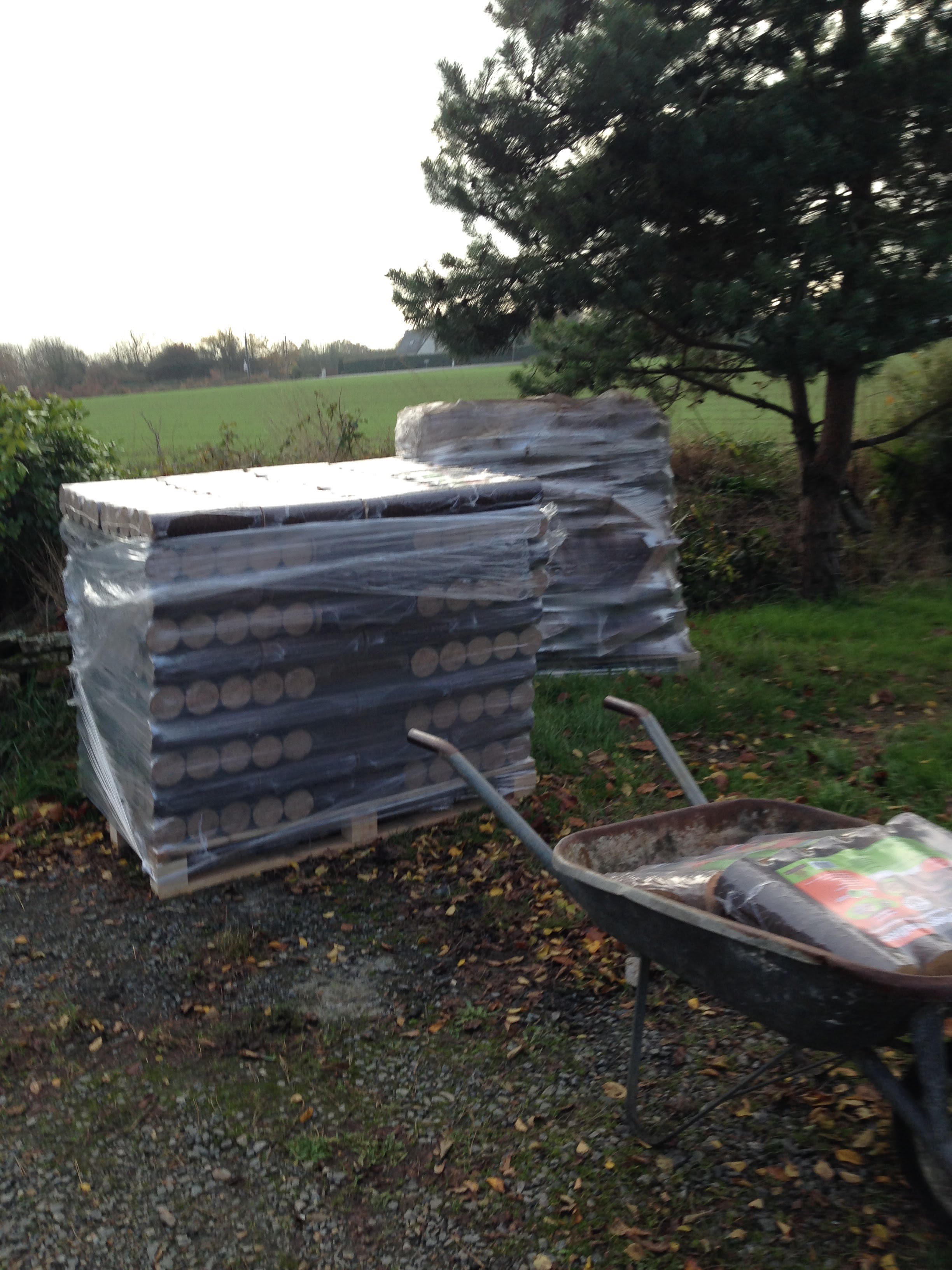 Il y a un an, une rentrée d’argent imprévue m’avait permis de faire livrer une palette de bûches de chêne de 30 cm par Bretagne multi-energies. Cette année, vivant enfin plus confortablement que ces dix dernières années, recevant encore une somme d’argent imprévue dans le budget, j’ai pu commander deux palettes. Une de chêne, charme et hêtre des forets bretonnes, une de bûches densifiées de chênes, un test après avoir testé des bûches densifiées dont la provenance venait de résineux sans origine garantie.